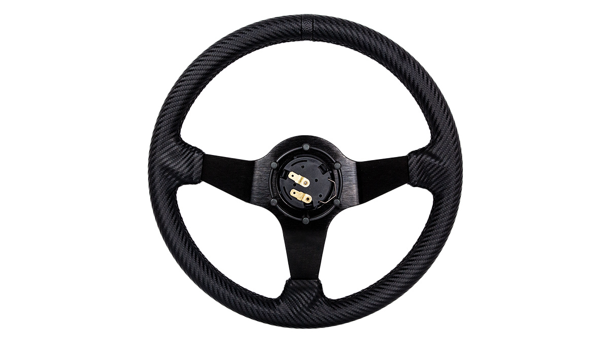 - Slide Odinis sportinis vairas 350mm(karbono raštas, juoda juostelė), 90 mm išnešimas